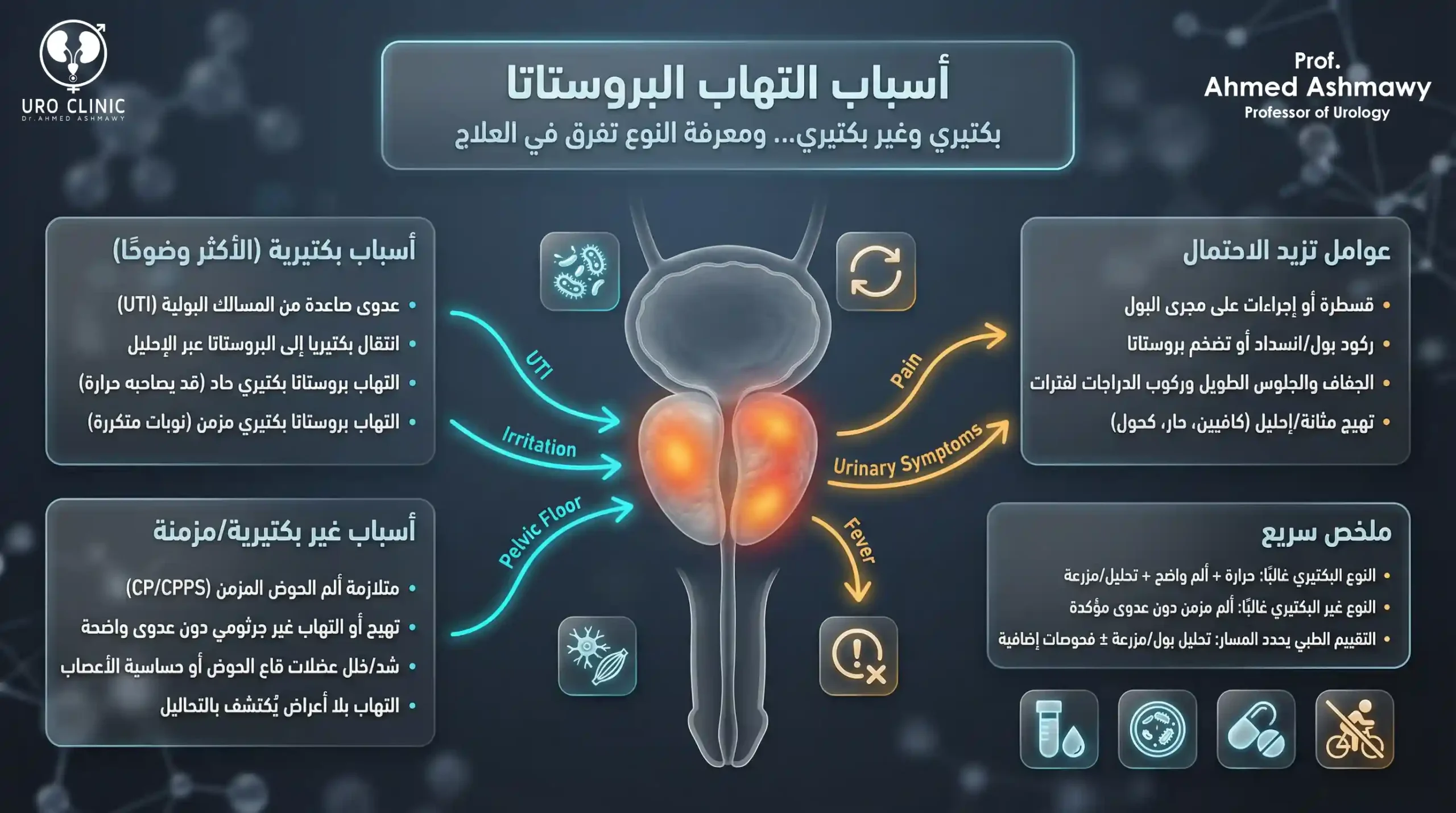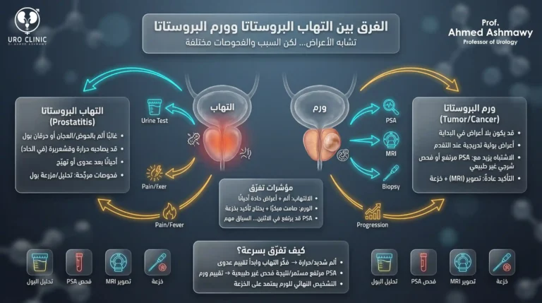 يعتبر التهاب البروستاتا من أكثر الشكاوى الصحية شيوعاً بين الرجال، وهو حالة تسبب الكثير من الانزعاج والقلق. في عيادة الدكتور أحمد عشماوي، نعتمد على أحدث بروتوكولات التشخيص لعام 2026 للتفرقة بين أنواع الالتهاب وضمان رحلة علاجية ناجحة.