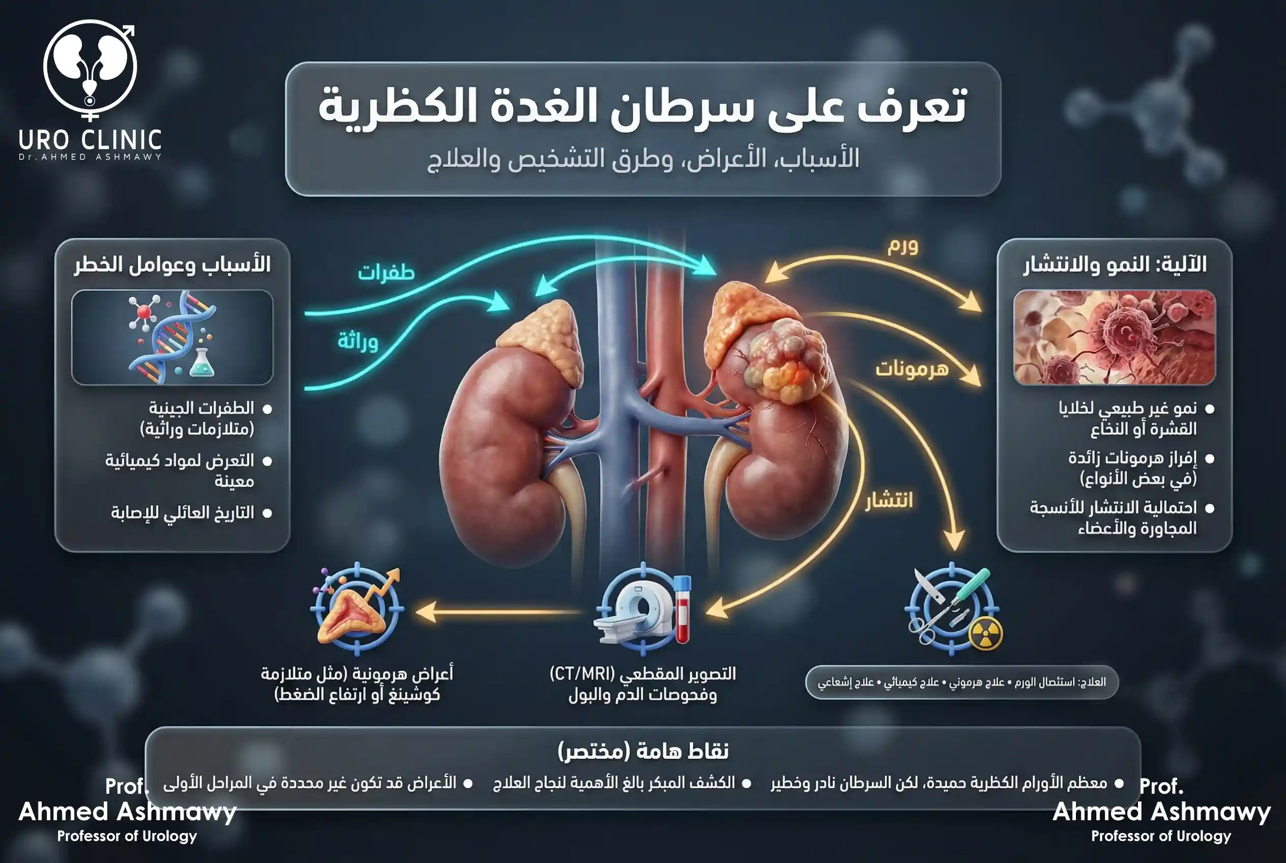 من المهم طمأنة المرضى بأن أغلب الكتل التي يتم اكتشافها في الغدة الكظرية هي أورام حميدة (Adenoma). ومع ذلك، فإن التفريق بين الحميد والخبيث يتطلب تقييماً دقيقاً من خبير جراحة المسالك البولية مثل الدكتور أحمد عشماوي، لضمان عدم إهمال أي ورم قد يمثل خطورة مستقبلاً.