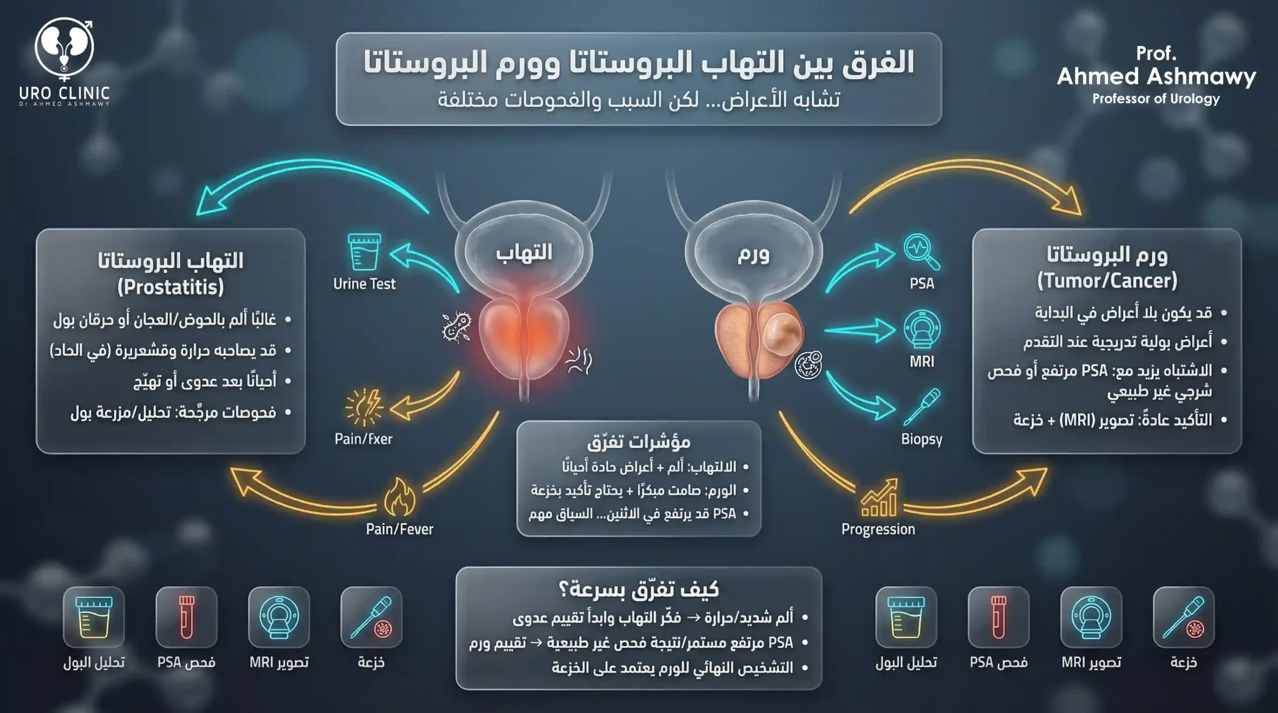يُعد الخلط بين التهاب البروستاتا وورم البروستاتا من أكثر الأمور الشائعة في عيادات المسالك البولية. رغم أن كلاهما يصيب نفس الغدة، إلا أن الطبيعة الطبية لكل منهما تختلف جذرياً من حيث الأسباب، الأعراض، وطريقة التعامل معها في عيادة الدكتور أحمد عشماوي.